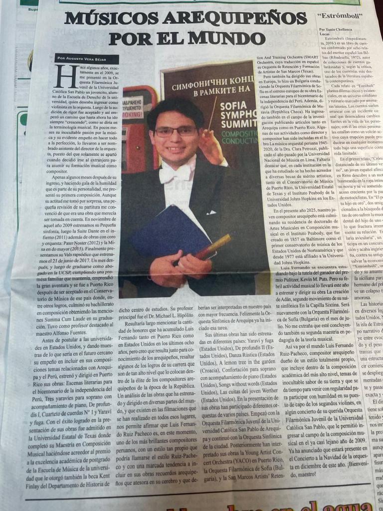 “Luis Fernando Ruiz-Pacheco, a former student of San Pablo Catholic University and a composer from the Conservatory of Music of Puerto Rico, was included in the book by musicologist and renowned violinist Clara Petrozzi: “Música orquestal peruana 1945-2020”, which was published by the National University of Music last year…”